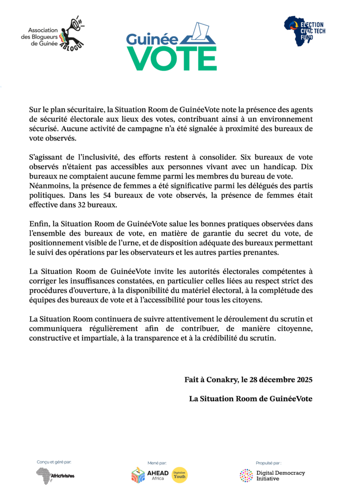 À l’occasion de l’élection présidentielle du 28 décembre 2025, l’Association des Blogueurs de Guinée (ABLOGUI), à travers son initiative d’observation électorale GuinéeVote, a déployé un dispositif citoyen de veille électorale sur l’ensemble du territoire national. Dans sa déclaration, rendue publique à la mi-journée, la Situation Room de GuinéeVote dresse un état des lieux détaillé de l’ouverture des bureaux de vote, mettant en lumière les points positifs observés ainsi que les insuffisances nécessitant des corrections rapides de la part des autorités électorales.